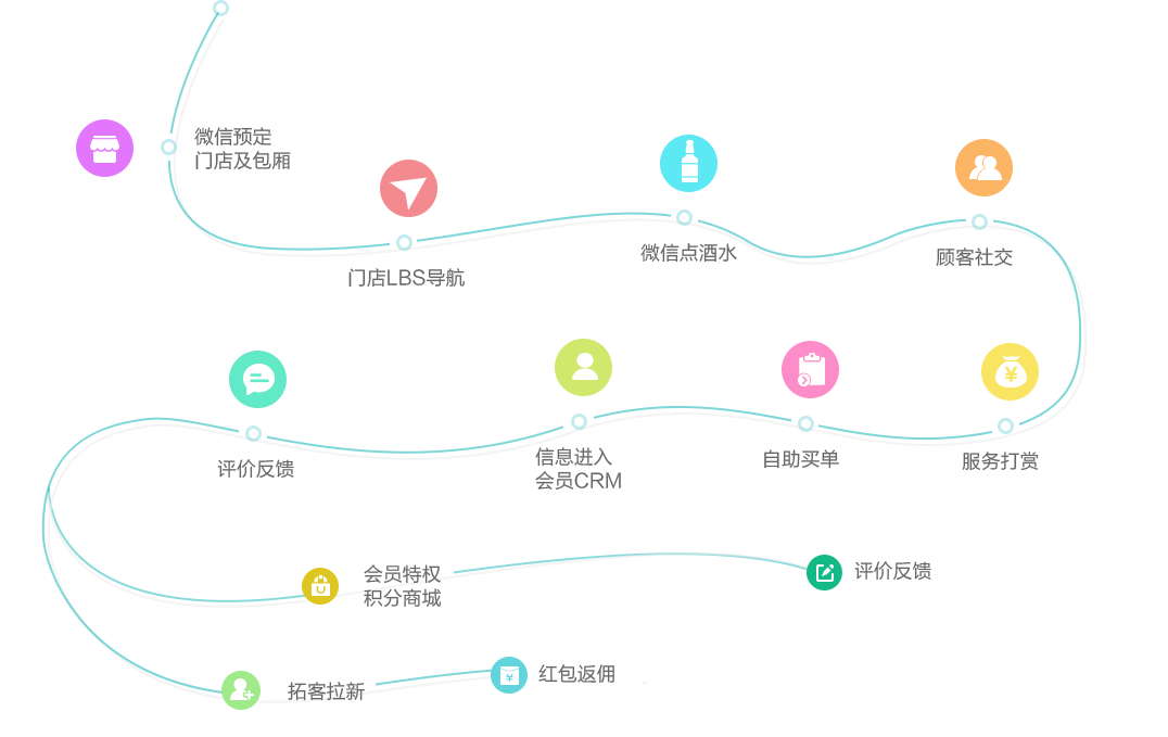 线上营销、微信预定门店及包厢、微信点酒水、自助买单等,全程高效、极优体验。